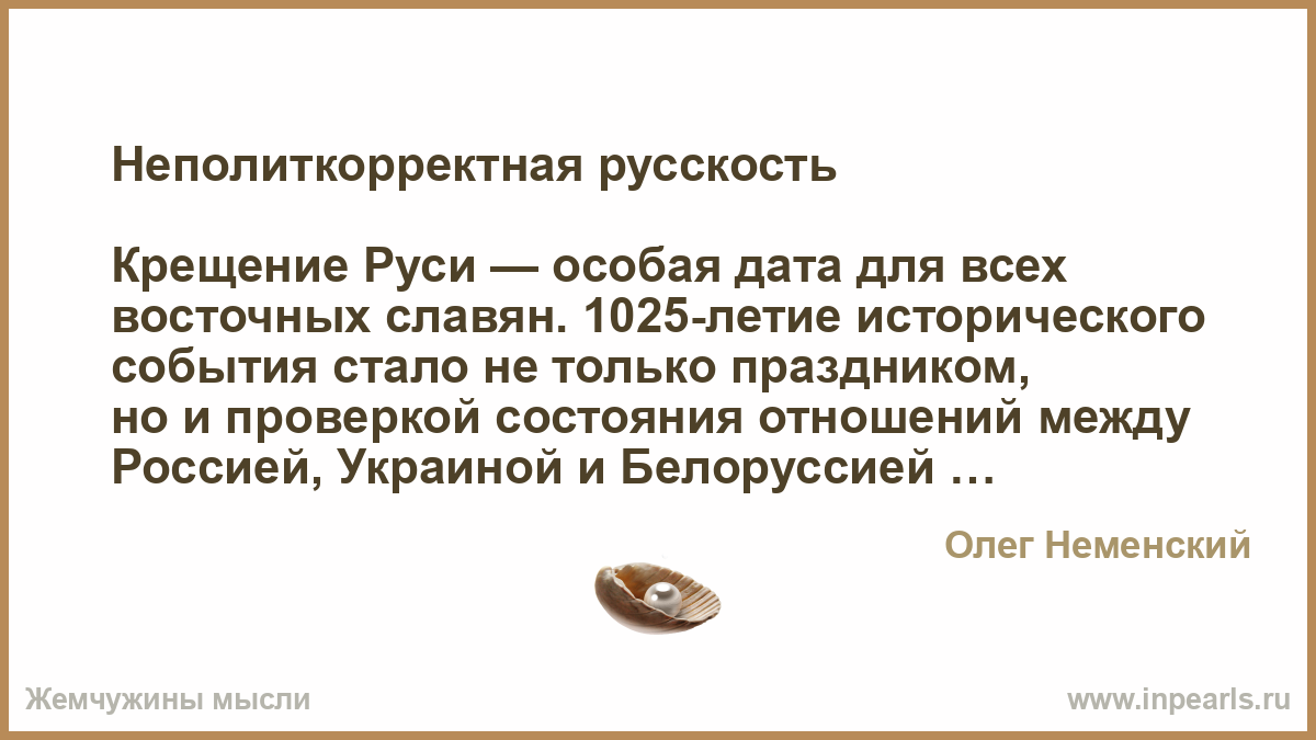 Для создаваемой у нас «многоконфессиональной российской нации» русское самосознание — это помеха, лишнее наследие далёкого и политически неактуального прошлого. И в России, и на Украине русское имя фактически нелегально — оно выведено из языка законов, оно не присутствует даже в названиях большинства общественных организаций — за двумя-тремя исключениями. Открыто сказать «я — русский» подчас трудно, ведь это как бы неполиткорректно. Так что тот факт, что трём президентам не удалось собраться в дни празднования вместе, в чём-то закономерен.