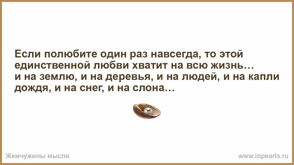 Если полюбите один раз навсегда, то этой единственной любви хватит на всю жизнь… и на землю, и на деревья, и на людей, и на капли дождя, и на снег, и на слона…