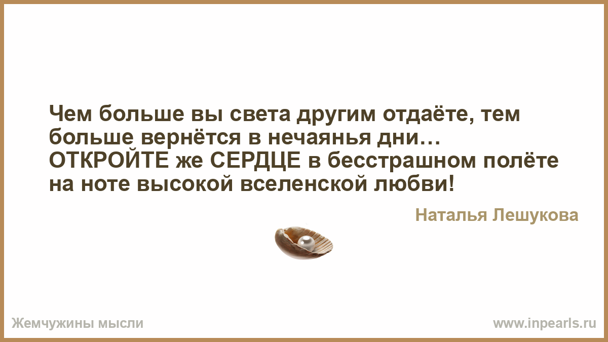 Чем больше вы света другим отдаёте, тем больше вернётся в нечаянья дни… ОТКРОЙТЕ же СЕРДЦЕ в бесстрашном полёте на ноте высокой вселенской любви!