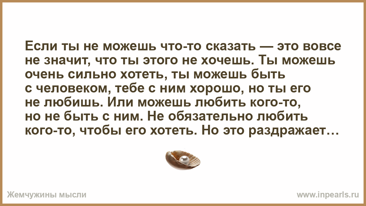Если ты не можешь что-то сказать — это вовсе не значит, что ты этого не хочешь. Ты можешь очень сильно хотеть, ты можешь быть с человеком, тебе с ним хорошо, но ты его не любишь. Или можешь любить кого-то, но не быть с ним. Не обязательно любить кого-то, чтобы его хотеть. Но это раздражает, утомительно, когда твои реальные желания не совпадают с возможностями. Но такова жизнь