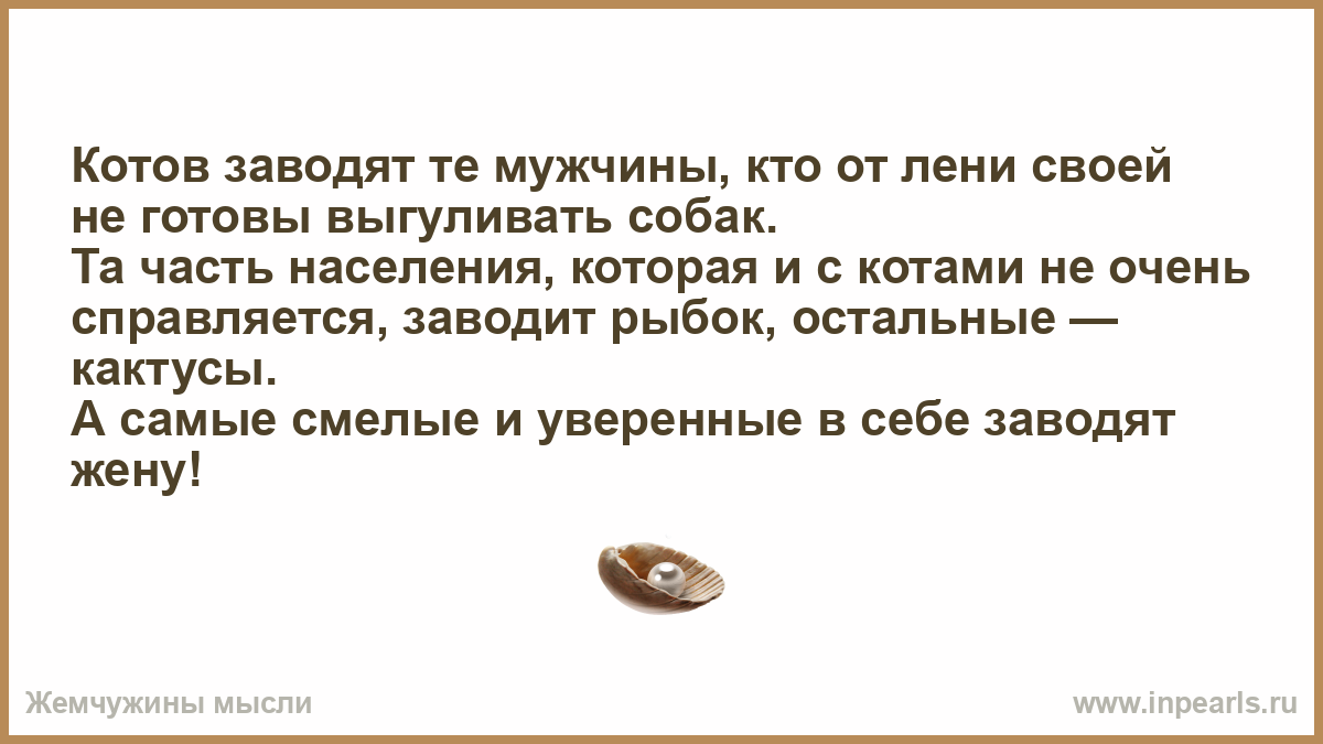 Котов заводят те мужчины, кто от лени своей не готовы выгуливать собак. Та часть населения, которая и с котами не очень справляется, заводит рыбок, остальные — кактусы. А самые смелые и уверенные в себе заводят жену!