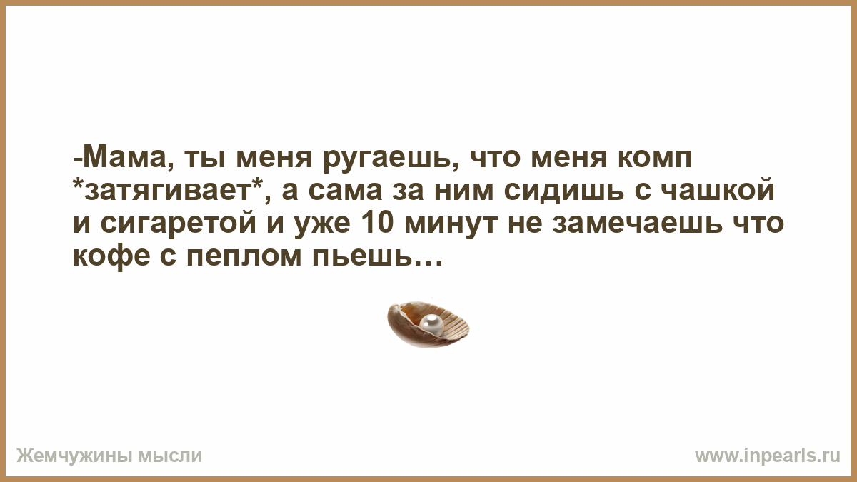 -Мама, ты меня ругаешь, что меня комп *затягивает*, а сама за ним сидишь с чашкой и сигаретой и уже 10 минут не замечаешь что кофе с пеплом пьешь…