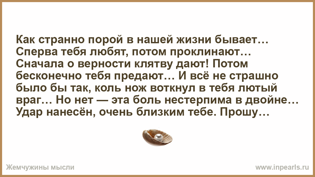 Как странно порой в нашей жизни бывает… Сперва тебя любят, потом проклинают… Сначала о верности клятву дают! Потом бесконечно тебя предают… И всё не страшно было бы так, коль нож воткнул в тебя лютый враг… Но нет — эта боль нестерпима в двойне… Удар нанесён, очень близким тебе. Прошу! — Никогда не клините судьбу! Без чувств никогда не говорите — Люблю! …Ведь ложные клятвы — пустые слова! Убить могут веру в Любовь — навсегда!