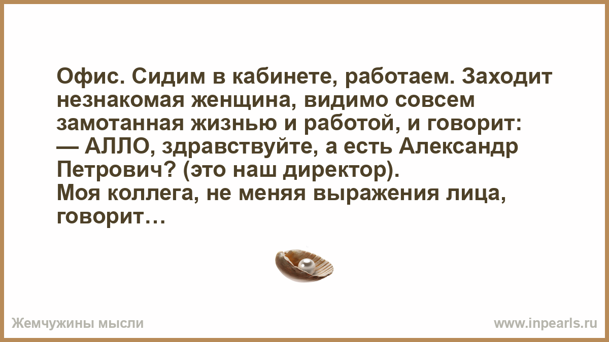 Офис. Сидим в кабинете, работаем. Заходит незнакомая женщина, видимо совсем замотанная жизнью и работой, и говорит: