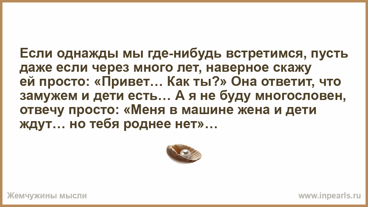 Если однажды мы где-нибудь встретимся, пусть даже если через много лет, наверное скажу ей просто: «Привет… Как ты?» Она ответит, что замужем и дети есть… А я не буду многословен, отвечу просто: «Меня в машине жена и дети ждут… но тебя роднее нет»…
