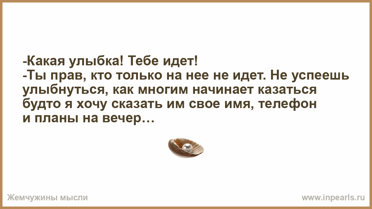-Какая улыбка! Тебе идет! -Ты прав, кто только на нее не идет. Не успеешь улыбнуться, как многим начинает казаться будто я хочу сказать им свое имя, телефон и планы на вечер…