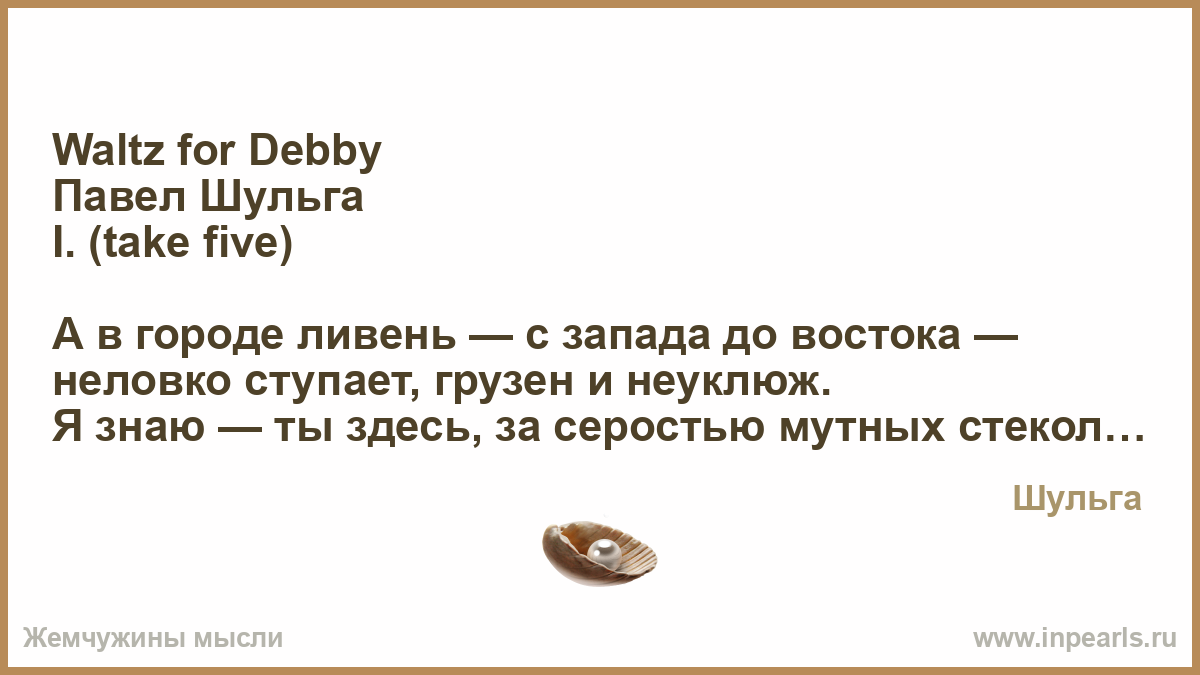 Сошедшая с фотографии в стиле ретро и, кажется, черно-белая даже днем, она шагает, прячась от злого ветра за спинами стен, за витринным слепым окном. В наушниках, ограждая ее от ада неонок, трамваев, брани и алкашей, вприпрыжку летит веселая кавалькада ударников, саксофонов и перкашей. Пальто из «двадцатых», стремительная походка, стучат каблучки по плачущей мостовой. Сиреневая сирена с луженой глоткой влетает в аккорды Брубека с головой. И хочется, защищая от непогоды, сложить незаметно над ней из ладоней зонт, да только я знаю: она лишь прибавит ходу и холодно улыбнется мне: «thank you, don’t».