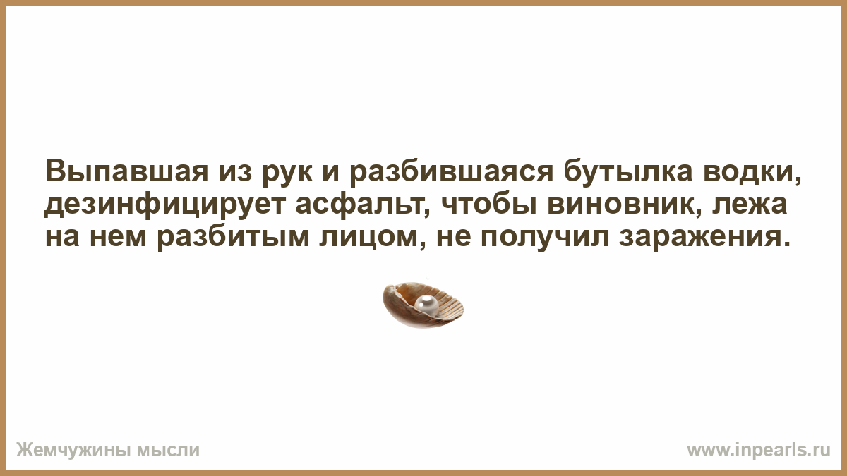 Выпавшая из рук и разбившаяся бутылка водки, дезинфицирует асфальт, чтобы виновник, лежа на нем разбитым лицом, не получил заражения.