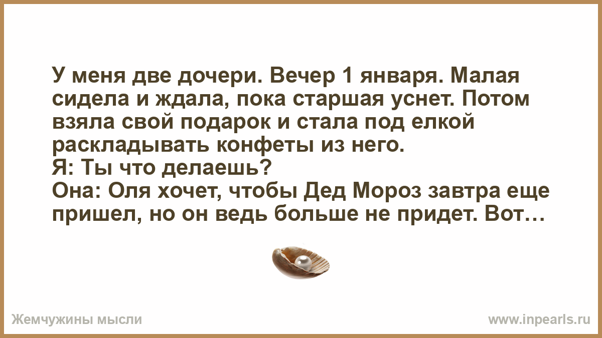 Она: Оля хочет, чтобы Дед Мороз завтра еще пришел, но он ведь больше не придет. Вот я хочу сделать ей приятное, чтобы она подумала, что Дед Мороз еще раз приходил.
