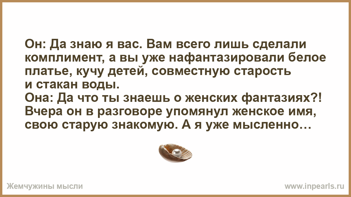 Он: Да знаю я вас. Вам всего лишь сделали комплимент, а вы уже нафантазировали белое платье, кучу детей, совместную старость и стакан воды.