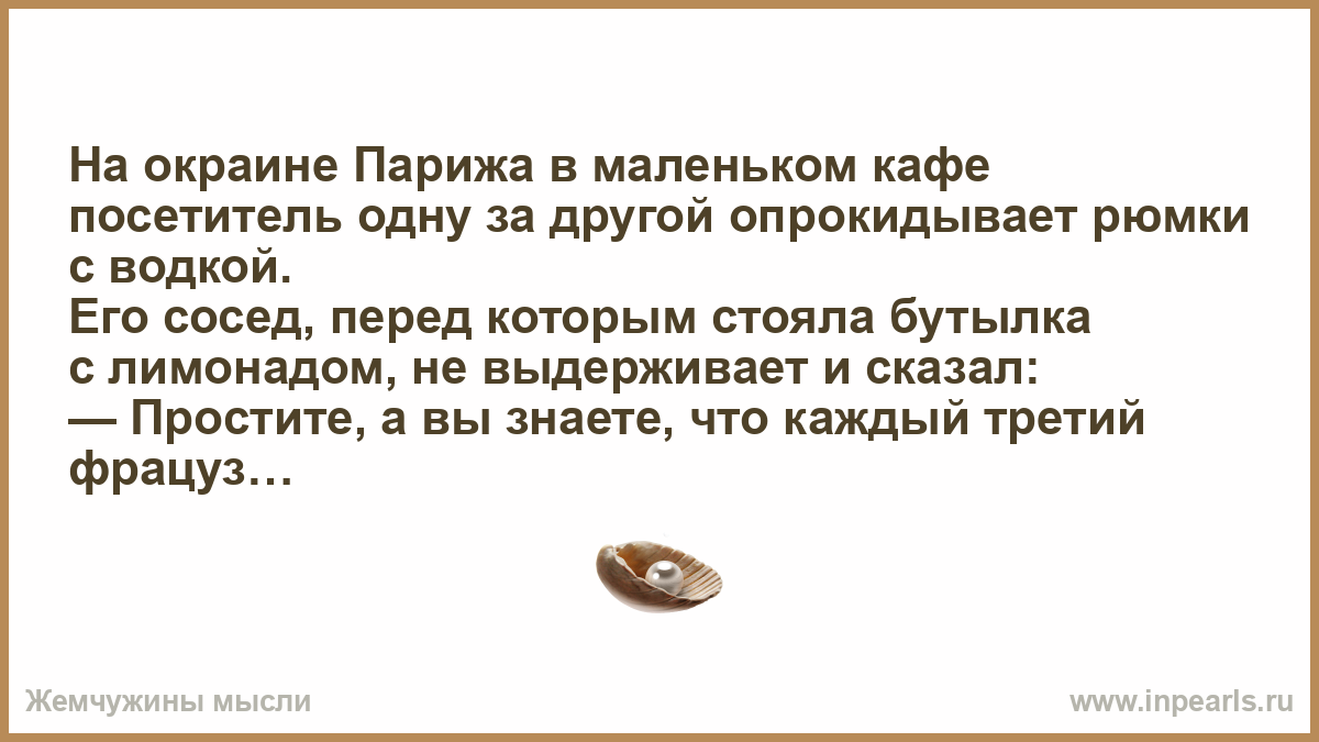На окраине Парижа в маленьком кафе посетитель одну за другой опрокидывает рюмки с водкой.