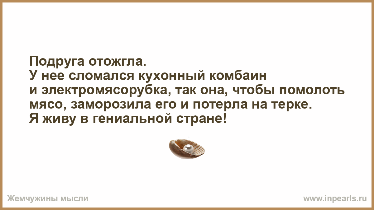 У нее сломался кухонный комбаин и электромясорубка, так она, чтобы помолоть мясо, заморозила его и потерла на терке.
