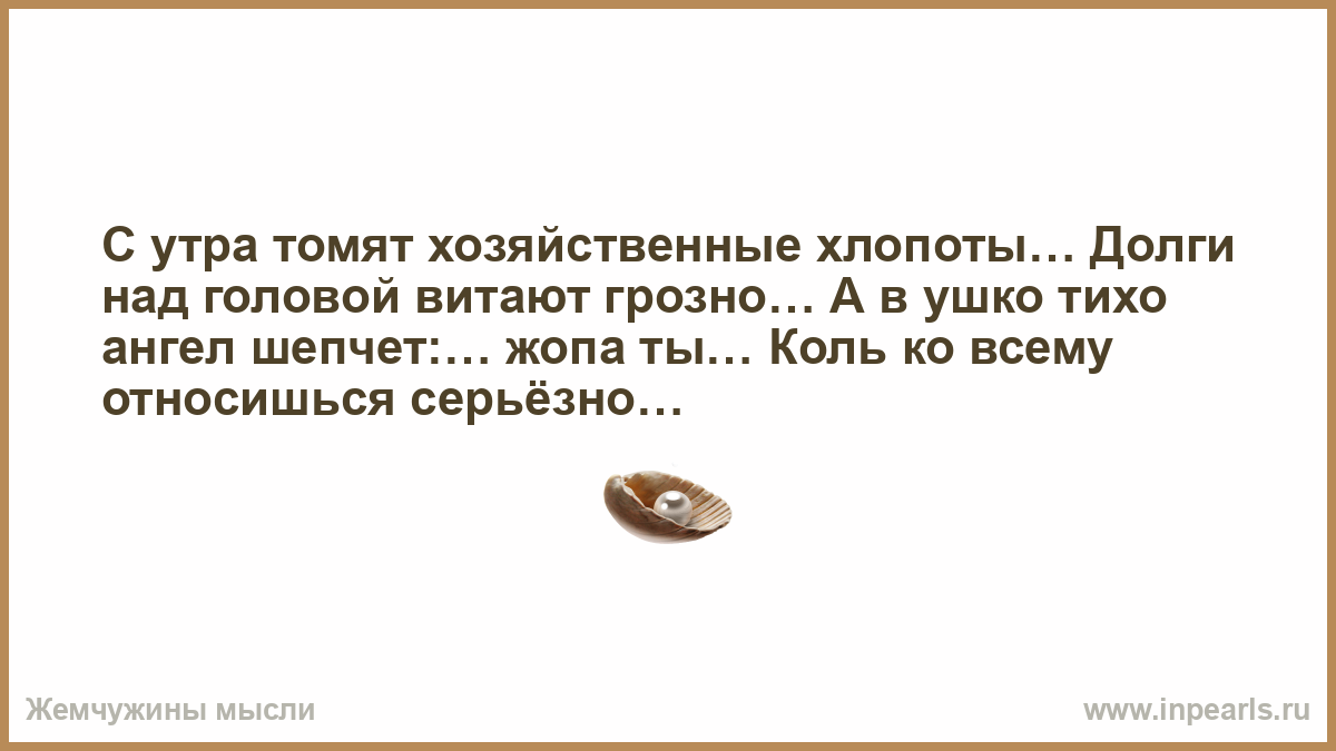 С утра томят хозяйственные хлопоты… Долги над головой витают грозно… А в ушко тихо ангел шепчет:… жопа ты… Коль ко всему относишься серьёзно…