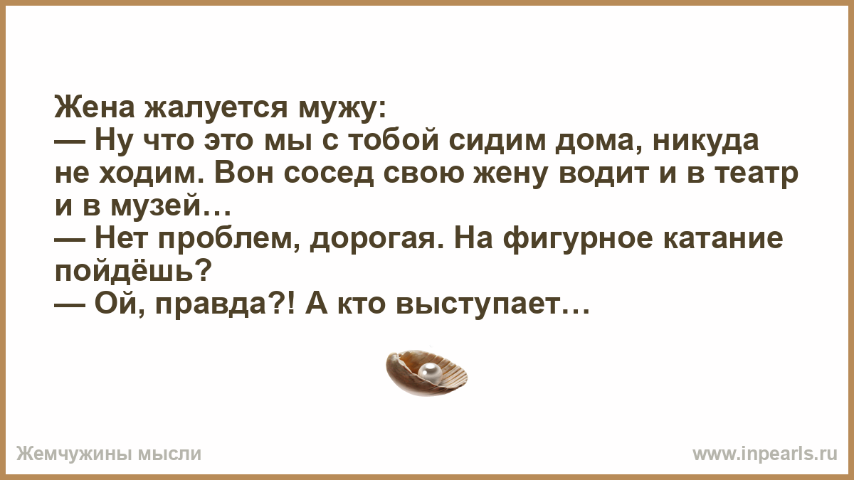 — Ну что это мы с тобой сидим дома, никуда не ходим. Вон сосед свою жену водит и в театр и в музей…