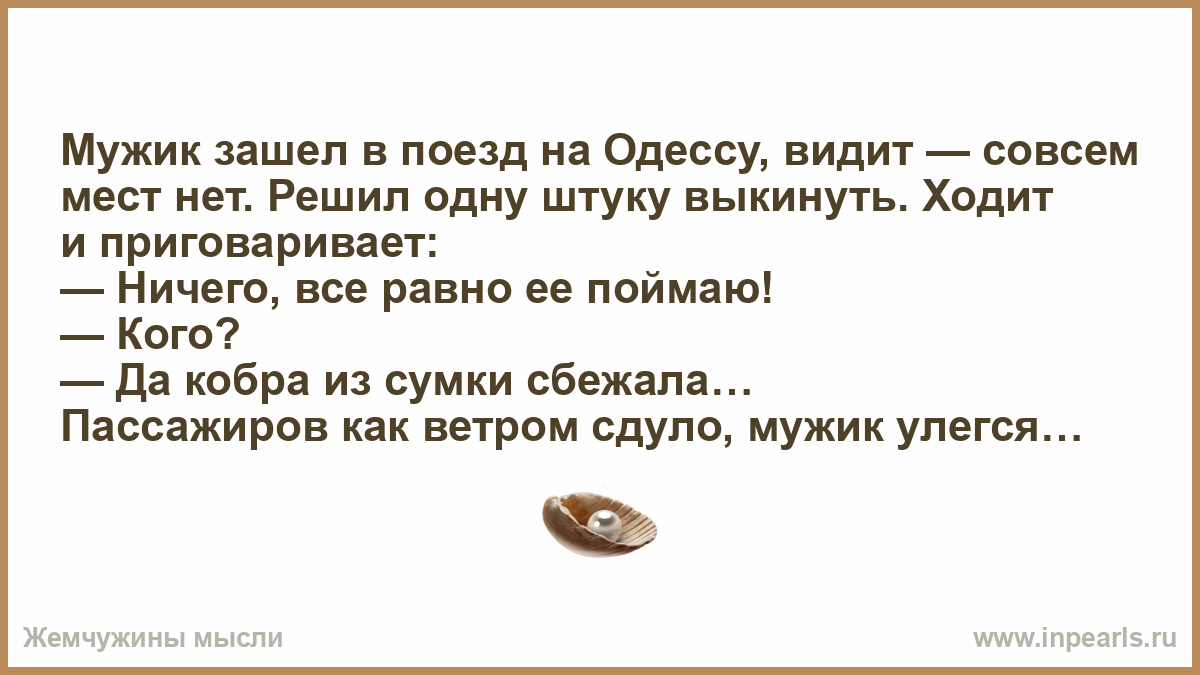 Мужик зашел в поезд на Одессу, видит — совсем мест нет. Решил одну штуку выкинуть. Ходит и приговаривает: