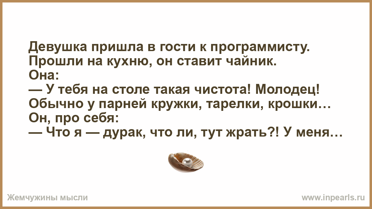Девушка пришла в гости к программисту. Прошли на кухню, он ставит чайник.