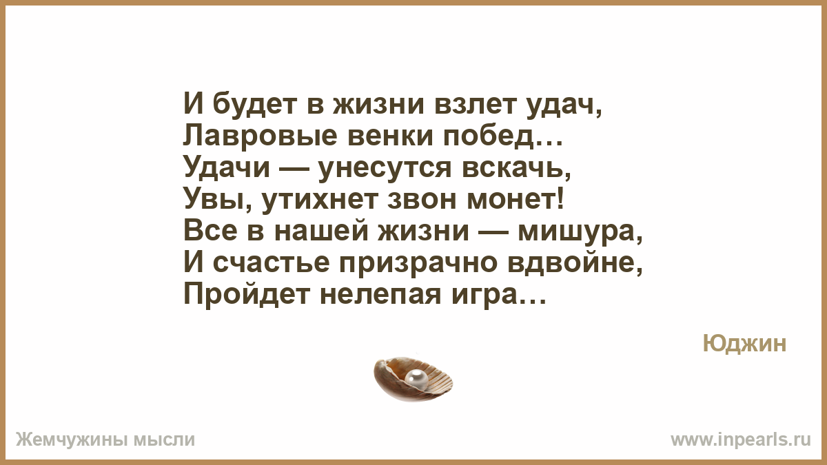 Его жена внезапно умерла… А он сидел до самого восхода, Все повторяя: «Как же ты могла?!» Перебирая вещи из комода… Глядел на тонкий шелк и кружева, Лет пять лежали вещи — не носила, «Все берегла… пока была жива… Куском обычной ткани дорожила… На всякий случай… Вот он и пришел! Загадываешь чуда, ждешь, мечтаешь… А кто-то взял… и за руку увёл! Особый случай — день, что проживаешь! Не оставлять на завтра! Жить сейчас! И не беречь посуду и одежду! Не доедать, не прятать про запас! И быть все время вместе, а не между… Беречь живой огонь любимых глаз, И каждый жест, и каждую улыбку, Все узелки, что связывают вас… Чтоб не жалеть, что совершил ошибку…»