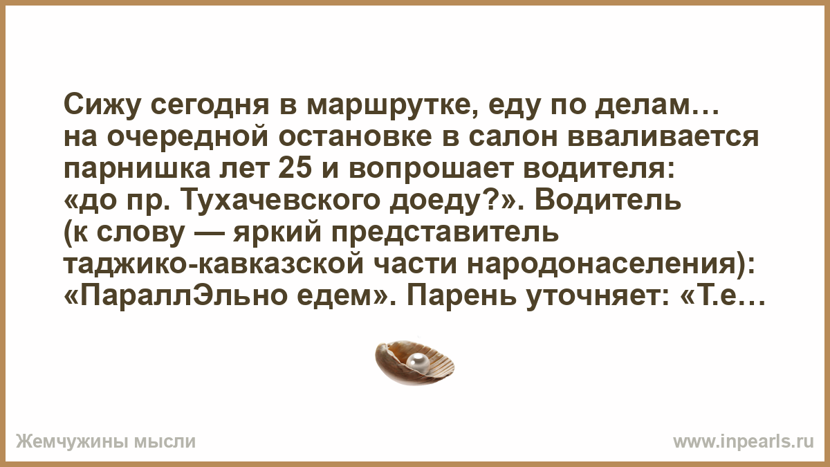 Сижу сегодня в маршрутке, еду по делам… на очередной остановке в салон вваливается парнишка лет 25 и вопрошает водителя: «до пр. Тухачевского доеду?». Водитель (к слову — яркий представитель таджико-кавказской части народонаселения): «ПараллЭльно едем». Парень уточняет: «Т.е. пересекаем?» (на этом месте я тихонько хрюкнул…) Водитель: «ПараллЭльно в эвклидовом понимании!»