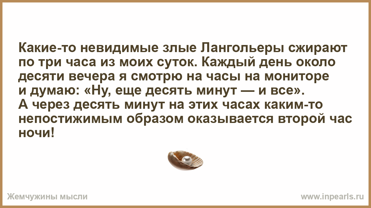 Какие-то невидимые злые Лангольеры сжирают по три часа из моих суток. Каждый день около десяти вечера я смотрю на часы на мониторе и думаю: «Ну, еще десять минут — и все». А через десять минут на этих часах каким-то непостижимым образом оказывается второй час ночи!