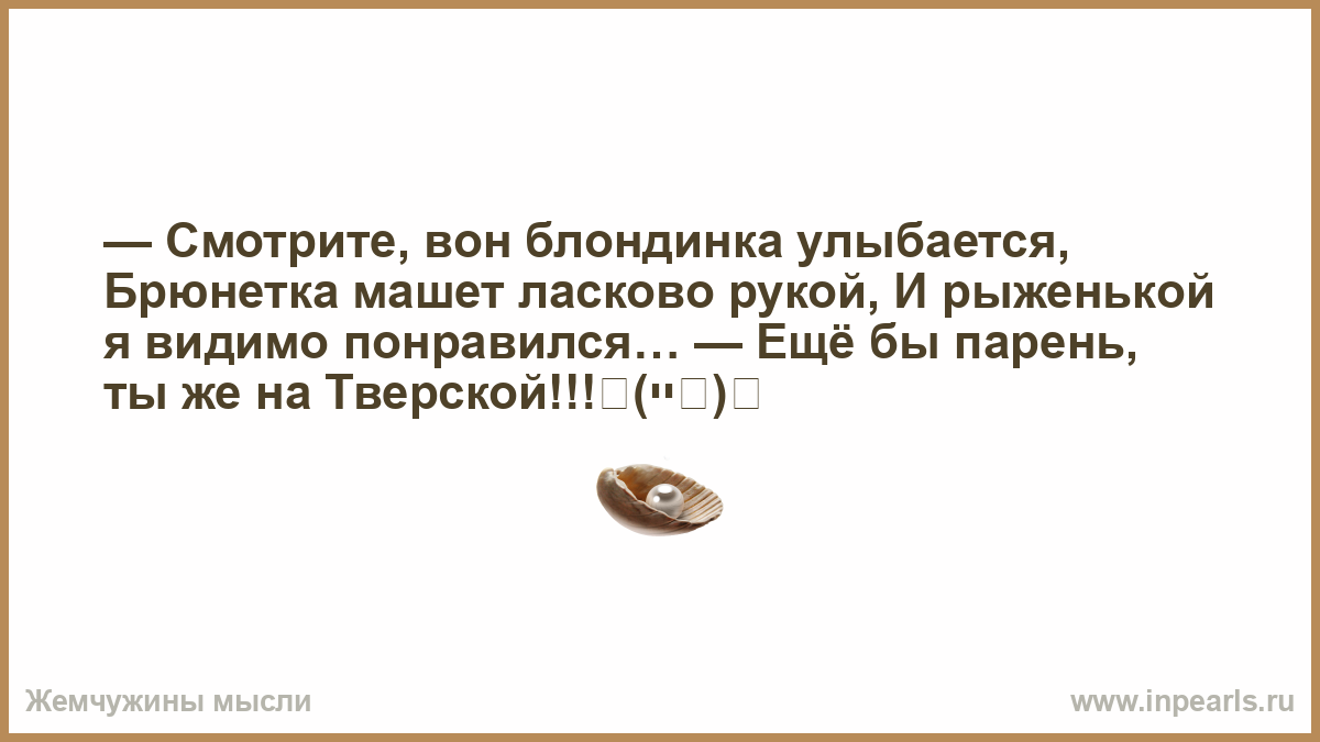 — Смотрите, вон блондинка улыбается, Брюнетка машет ласково рукой, И рыженькой я видимо понравился… — Ещё бы парень, ты же на Тверской!!!ღ(ړײ)ღ ​ ​