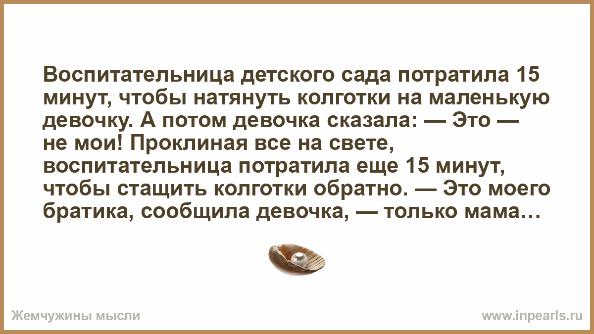 Воспитательница детского сада потратила 15 минут, чтобы натянуть колготки на маленькую девочку. А потом девочка сказала: — Это — не мои! Проклиная все на свете, воспитательница потратила еще 15 минут, чтобы стащить колготки обратно. — Это моего братика, сообщила девочка, — только мама сегодня надела их на меня!)))))
