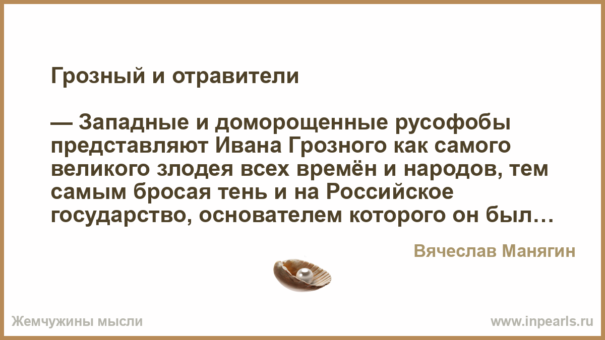 — Западные и доморощенные русофобы представляют Ивана Грозного как самого великого злодея всех времён и народов, тем самым бросая тень и на Российское государство, основателем которого он был, и на русский народ, который Ивана Васильевича очень уважал.