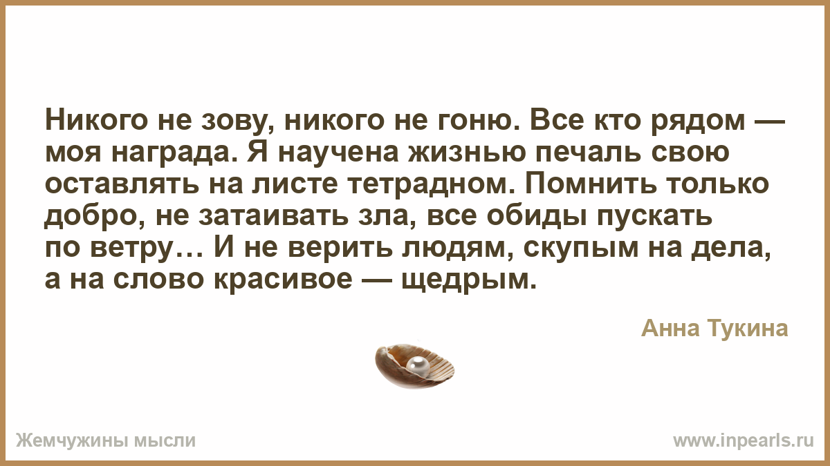 Никого не зову, никого не гоню. Все кто рядом — моя награда. Я научена жизнью печаль свою оставлять на листе тетрадном. Помнить только добро, не затаивать зла, все обиды пускать по ветру… И не верить людям, скупым на дела, а на слово красивое — щедрым.