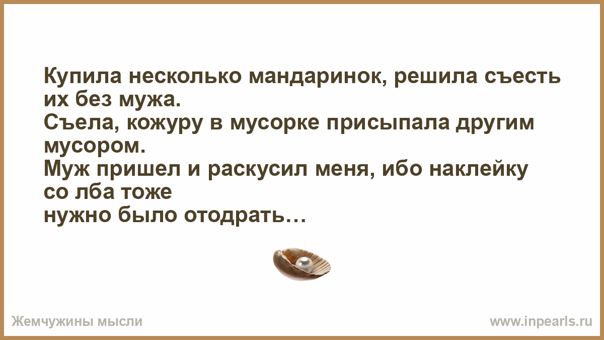 Слушай! Я тут недавно на рынке была. Ой! Один мужик торговал, знаешь, чем?.. ЗЁРНЫШКАМИ ИЗ ЯБЛОК! Они, говорит, ИНТЕЛЛЕКТ повышают. Ну я купила у него десять зёрнышек за двести рублей… съела… и говорю: «Блин!.. На эти деньги я же могла купить МНОГО ЯБЛОК!.. И наковырять много зёрнышек!!!»