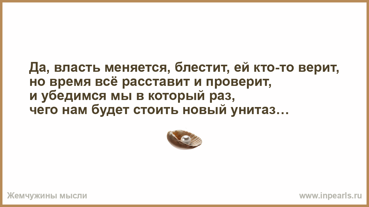 Да, власть меняется, блестит, ей кто-то верит, но время всё расставит и проверит, и убедимся мы в который раз, чего нам будет стоить новый унитаз…