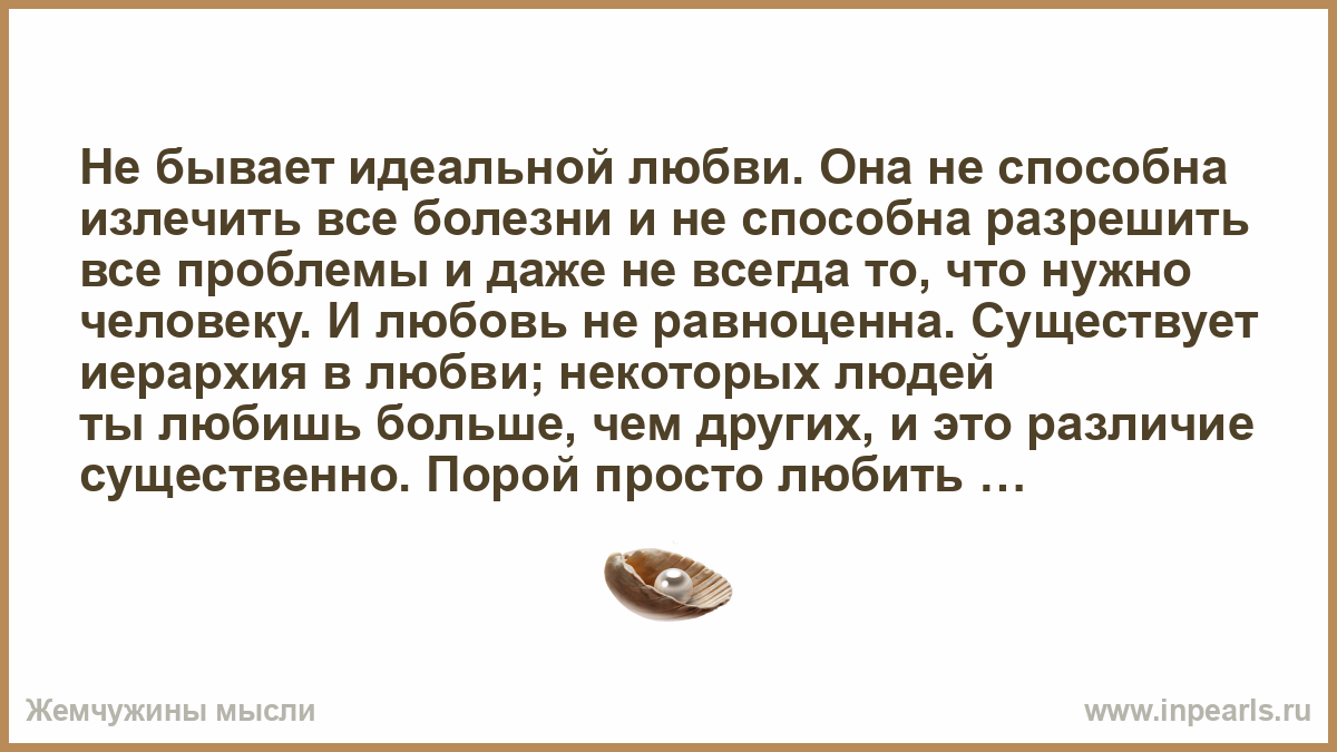 Не бывает идеальной любви. Она не способна излечить все болезни и не способна разрешить все проблемы и даже не всегда то, что нужно человеку. И любовь не равноценна. Существует иерархия в любви; некоторых людей ты любишь больше, чем других, и это различие существенно. Порой просто любить — недостаточно. Порой любовь требует тебя целиком.