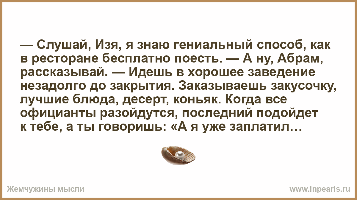 — Слушай, Изя, я знаю гениальный способ, как в ресторане бесплатно поесть. — А ну, Абрам, рассказывай. — Идешь в хорошее заведение незадолго до закрытия. Заказываешь закусочку, лучшие блюда, десерт, коньяк. Когда все официанты разойдутся, последний подойдет к тебе, а ты говоришь: «А я уже заплатил вашему товарищу, что ушел». На следующий день пошли в ресторан. Заказывают все по полной программе и сидят. Наконец подходит последний официант: — Извините, но пора закрывать, прошу оплатить заказ. Абрам: — Но мы уже вашему коллеге деньги дали. Изя: — Кстати, нам еще долго ждать сдачу?