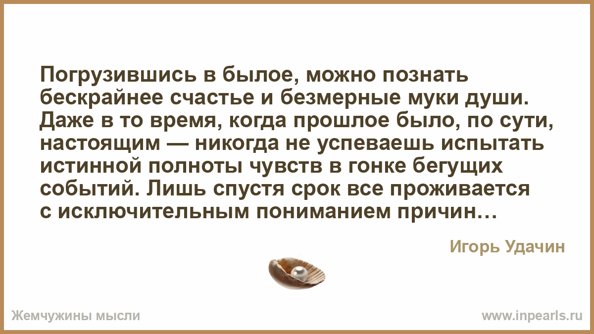 Погрузившись в былое, можно познать бескрайнее счастье и безмерные муки души. Даже в то время, когда прошлое было, по сути, настоящим — никогда не успеваешь испытать истинной полноты чувств в гонке бегущих событий. Лишь спустя срок все проживается с исключительным пониманием причин и следствий тех или иных поступков, которые совершались. Считается, взгляд человека устремлен в будущее, и поэтому ради иллюзорного будущего так много делается на Земле. Однако разве секрет, что человек склонен чаще жить именно дарами прошлого — ностальгией? И в этом вся скорбь его бренного существования.