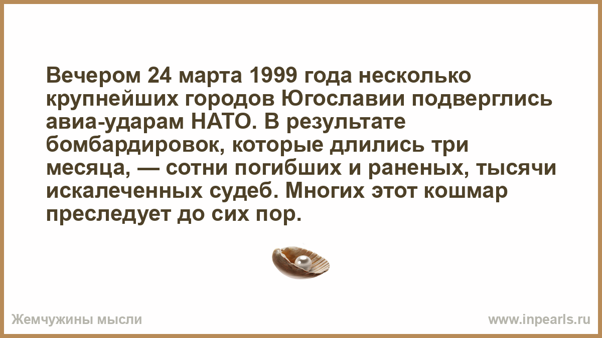 Вечером 24 марта 1999 года несколько крупнейших городов Югославии подверглись авиа-ударам НАТО. В результате бомбардировок, которые длились три месяца, — сотни погибших и раненых, тысячи искалеченных судеб. Многих этот кошмар преследует до сих пор.