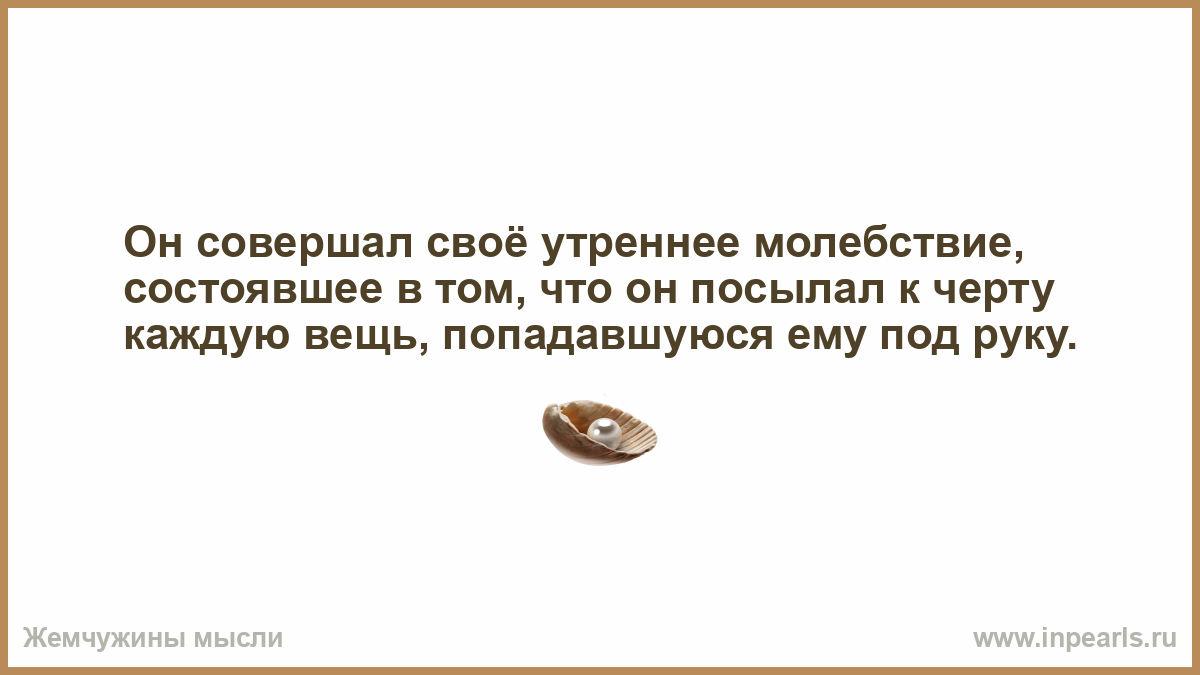 Он совершал своё утреннее молебствие, состоявшее в том, что он посылал к черту каждую вещь, попадавшуюся ему под руку.