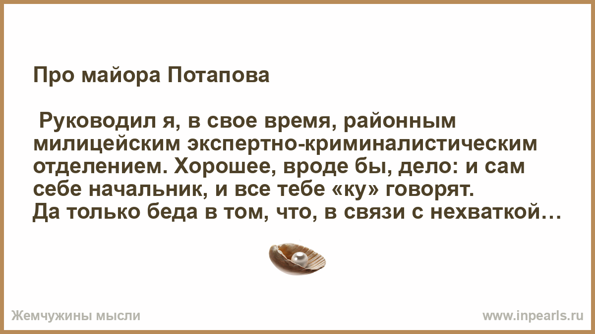 «МАЙОР Потапов — нетрезв, небрит, нарушает форму одежды». И, наконец, гордо отбывает. Вскоре звонит оперативный из соседнего райотдела и слезно умоляет нашего дежурного дать ему эксперта на квартирную кражу. Дежурный, счастливый тем,