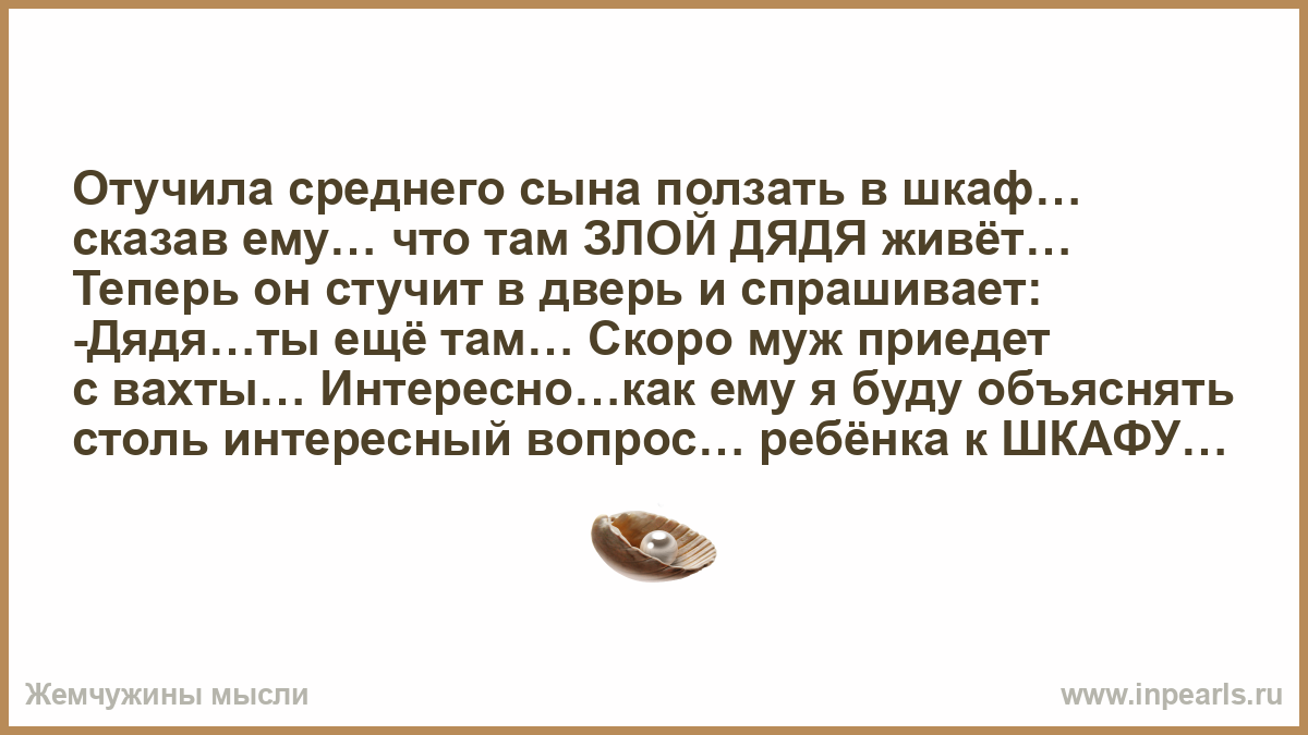 Отучила среднего сына ползать в шкаф… сказав ему… что там ЗЛОЙ ДЯДЯ живёт… Теперь он стучит в дверь и спрашивает: -Дядя…ты ещё там… Скоро муж приедет с вахты… Интересно…как ему я буду объяснять столь интересный вопрос… ребёнка к ШКАФУ…