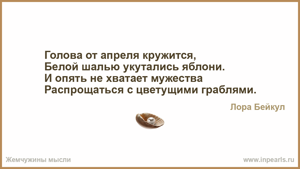 Голова от апреля кружится, Белой шалью укутались яблони. И опять не хватает мужества Распрощаться с цветущими граблями.