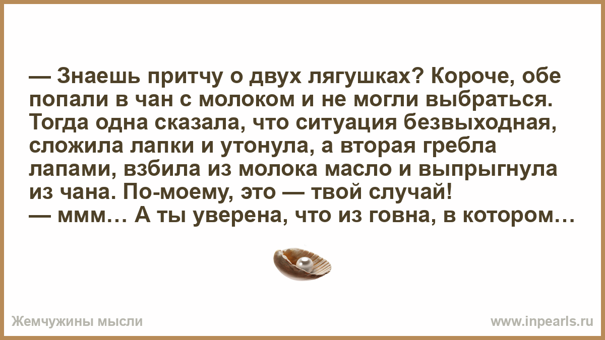 — Знаешь притчу о двух лягушках? Короче, обе попали в чан с молоком и не могли выбраться. Тогда одна сказала, что ситуация безвыходная, сложила лапки и утонула, а вторая гребла лапами, взбила из молока масло и выпрыгнула из чана. По-моему, это — твой случай!