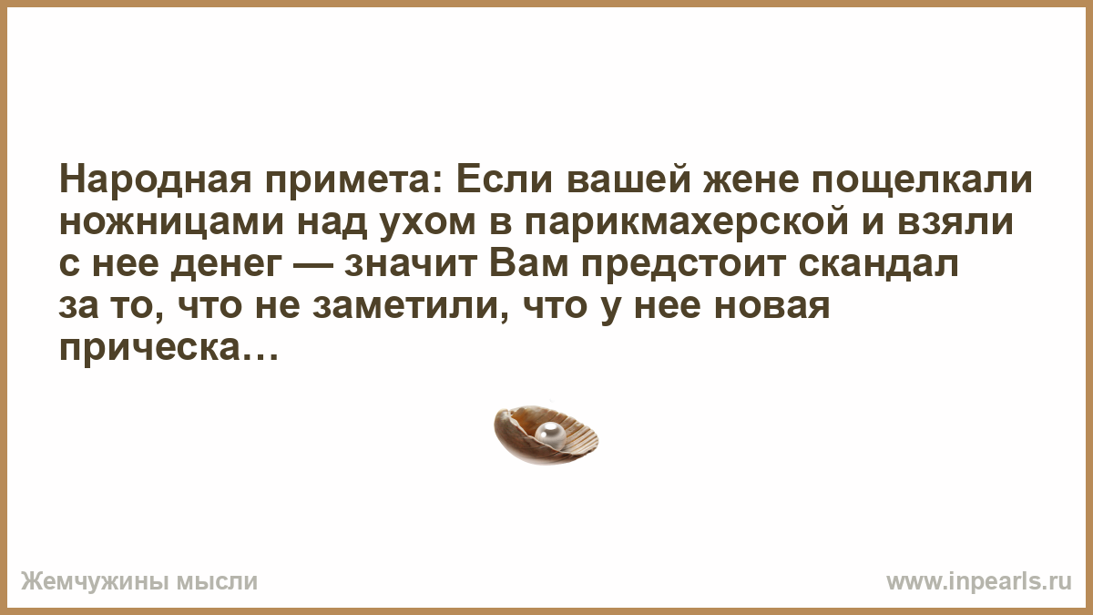 Народная примета: Если вашей жене пощелкали ножницами над ухом в парикмахерской и взяли с нее денег — значит Вам предстоит скандал за то, что не заметили, что у нее новая прическа…