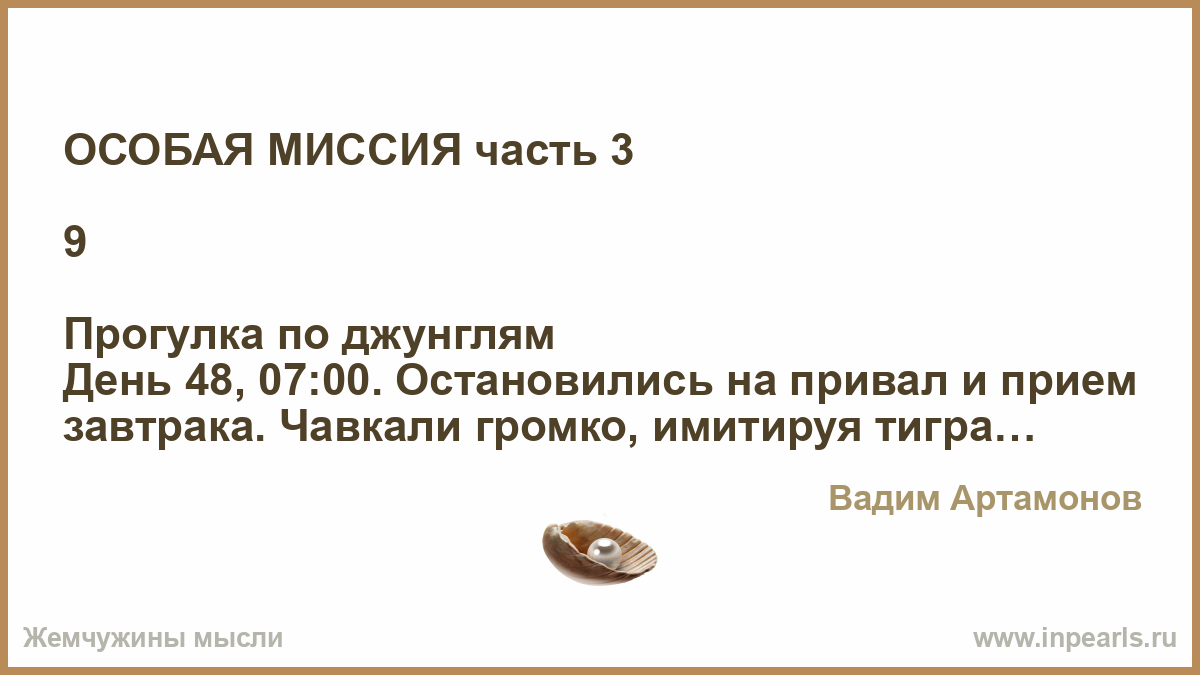 День 48, 07:00. Остановились на привал и прием завтрака. Чавкали громко, имитируя тигра, чтобы отпугнуть нежелательных гостей. А если заглянет тигр, то ему устроим тигрусигальпу по полной программе и улучшенной методике. Выпили по стаканчику спирта для улучшения пищеварения. Закусили шашлыком из скорпионов, которых отловили мышеловками с приманкой из тушенки.