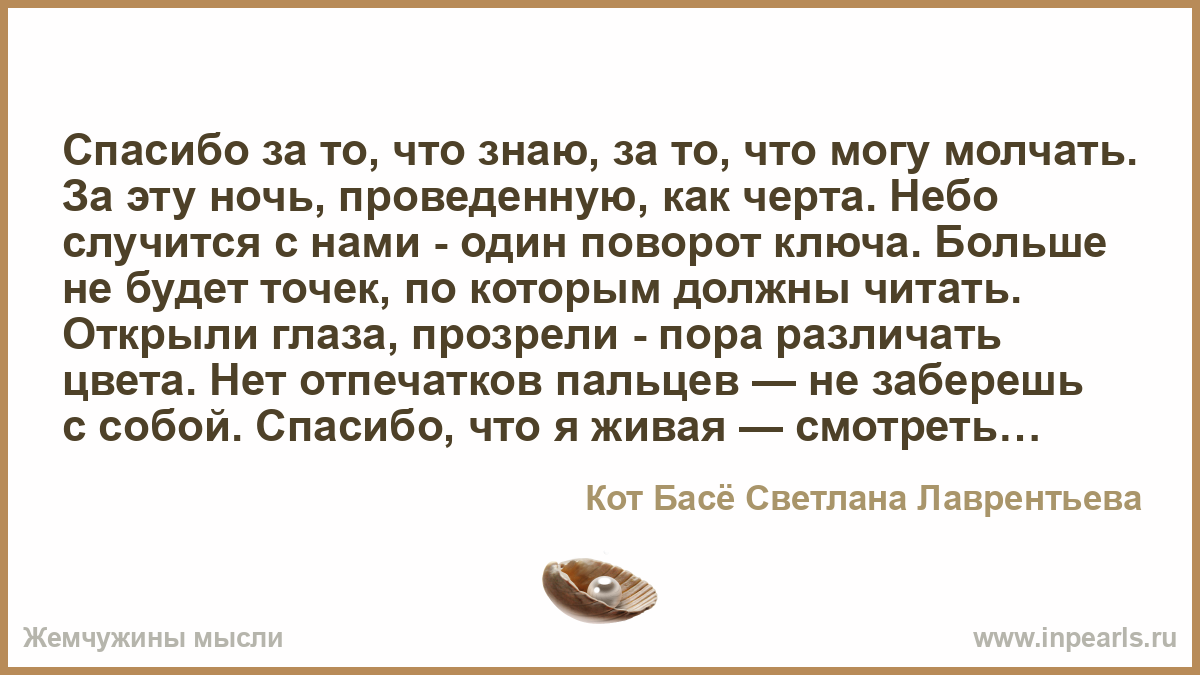 Спасибо за то, что знаю, за то, что могу молчать. За эту ночь, проведенную, как черта. Небо случится с нами - один поворот ключа. Больше не будет точек, по которым должны читать. Открыли глаза, прозрели - пора различать цвета. Нет отпечатков пальцев — не заберешь с собой. Спасибо, что я живая — смотреть в белизну листа, во взгляде ее купаться — пронзительно-голубой, морской — набегают волны, не вынырнуть, не вдохнуть. Над нами Господня милость — сильнее любой борьбы.