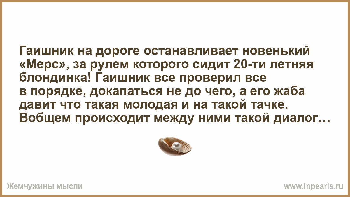 Гаишник на дороге останавливает новенький «Мерс», за рулем которого сидит 20-ти летняя блондинка! Гаишник все проверил все в порядке, докапаться не до чего, а его жаба давит что такая молодая и на такой тачке. Вобщем происходит между ними такой диалог: