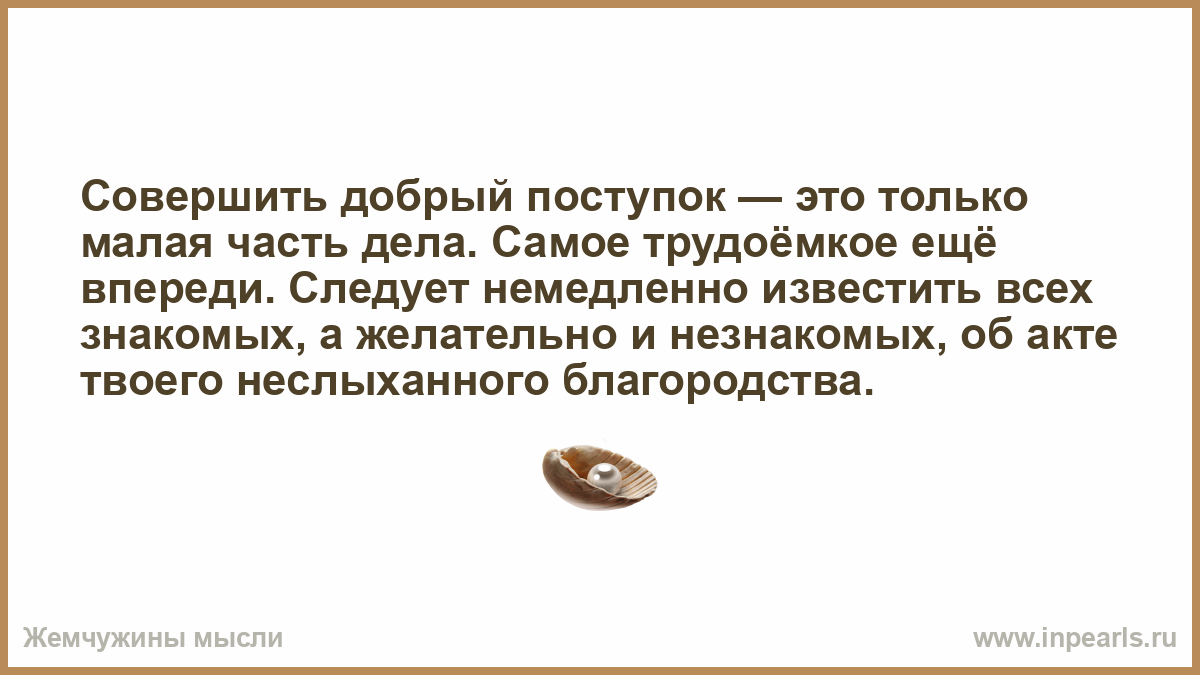 Совершить добрый поступок — это только малая часть дела. Самое трудоёмкое ещё впереди. Следует немедленно известить всех знакомых, а желательно и незнакомых, об акте твоего неслыханного благородства.