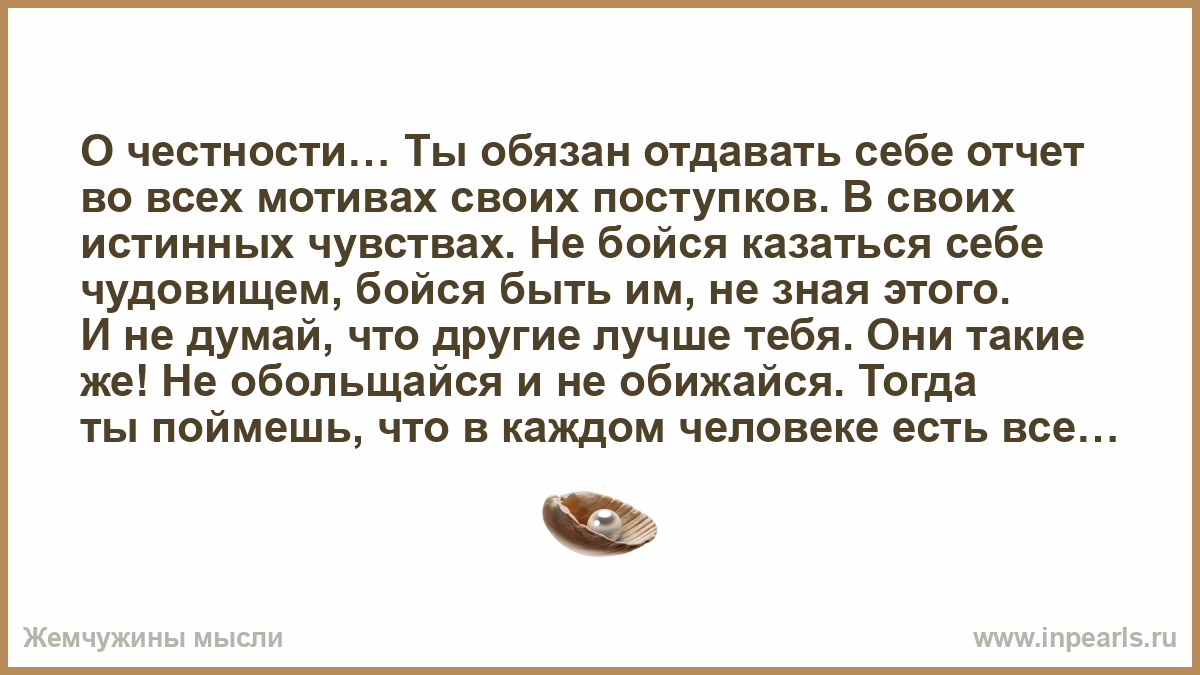 О честности… Ты обязан отдавать себе отчет во всех мотивах своих поступков. В своих истинных чувствах. Не бойся казаться себе чудовищем, бойся быть им, не зная этого. И не думай, что другие лучше тебя. Они такие же! Не обольщайся и не обижайся. Тогда ты поймешь, что в каждом человеке есть все. Все чувства и мотивы, и святость и злодейство.