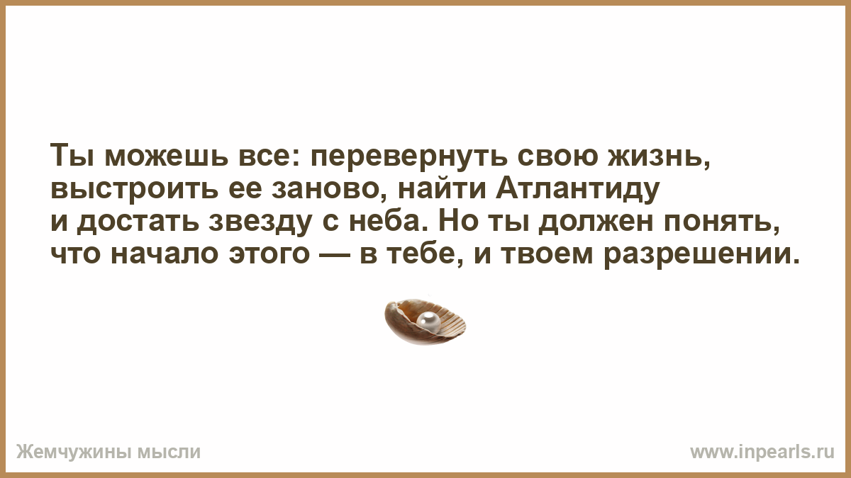 Ты можешь все: перевернуть свою жизнь, выстроить ее заново, найти Атлантиду и достать звезду с неба. Но ты должен понять, что начало этого — в тебе, и твоем разрешении.