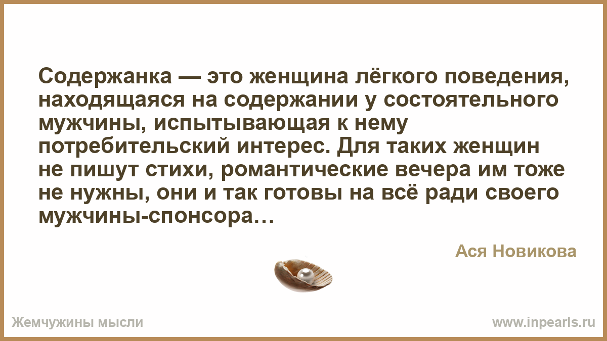 Содержанка — это женщина лёгкого поведения, находящаяся на содержании у состоятельного мужчины, испытывающая к нему потребительский интерес. Для таких женщин не пишут стихи, романтические вечера им тоже не нужны, они и так готовы на всё ради своего мужчины-спонсора.