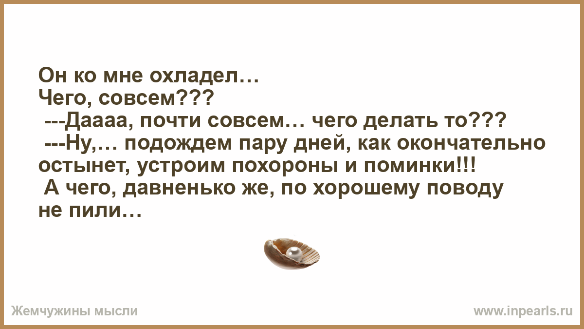 Он ко мне охладел… Чего, совсем??? ---Даааа, почти совсем… чего делать то??? ---Ну,… подождем пару дней, как окончательно остынет, устроим похороны и поминки!!! А чего, давненько же, по хорошему поводу не пили…