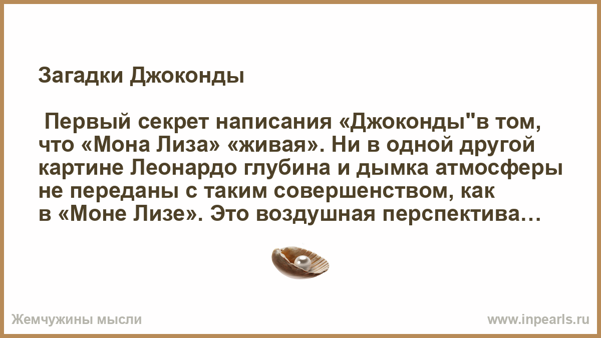 Первый секрет написания «Джоконды"в том, что «Мона Лиза» «живая». Ни в одной другой картине Леонардо глубина и дымка атмосферы не переданы с таким совершенством, как в «Моне Лизе». Это воздушная перспектива, вероятно, лучшая по исполнению. «Джоконда» получила всемирную славу не только из-за качества работы Леонардо, которая впечатляет и художественных любителей и профессионалов. Картина изучалась историками и копировалась живописцами, но она бы долго оставалась известной только для знатоков искусства, если бы не её исключительная история.