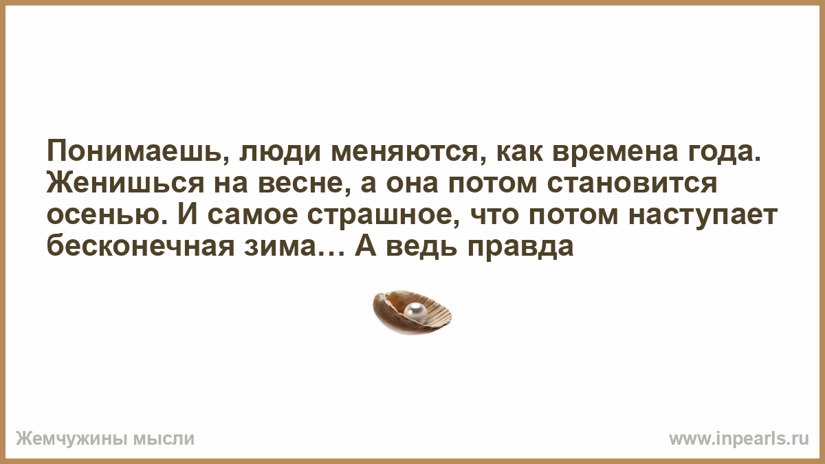 Понимаешь, люди меняются, как времена года. Женишься на весне, а она потом становится осенью. И самое страшное, что потом наступает бесконечная зима… А ведь правда