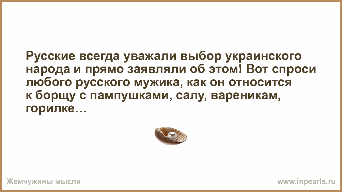 Русские всегда уважали выбор украинского народа и прямо заявляли об этом! Вот спроси любого русского мужика, как он относится к борщу с пампушками, салу, вареникам, горилке…